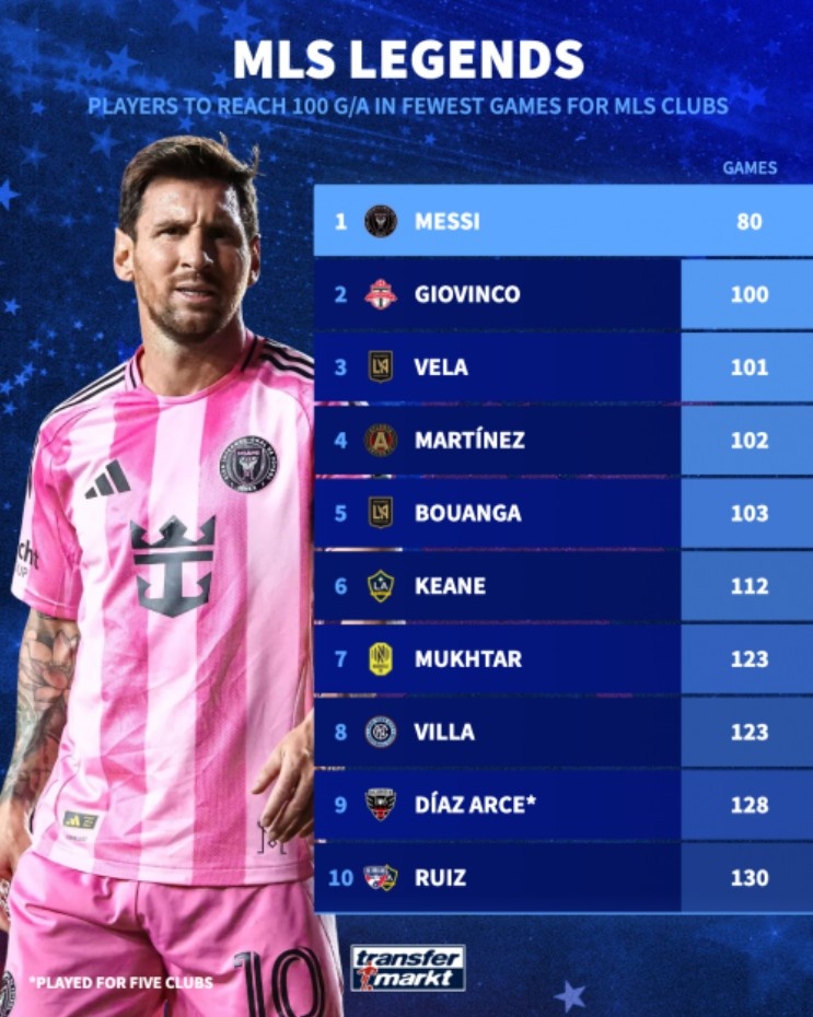 美职联球员参与百球场次排行:梅西80场最快,第二乔文科100场