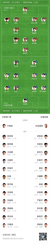 10月25日讯 北京时间15:30,中超第28轮,天津津门虎vs长春亚泰,赛前官方公布首发阵容。
