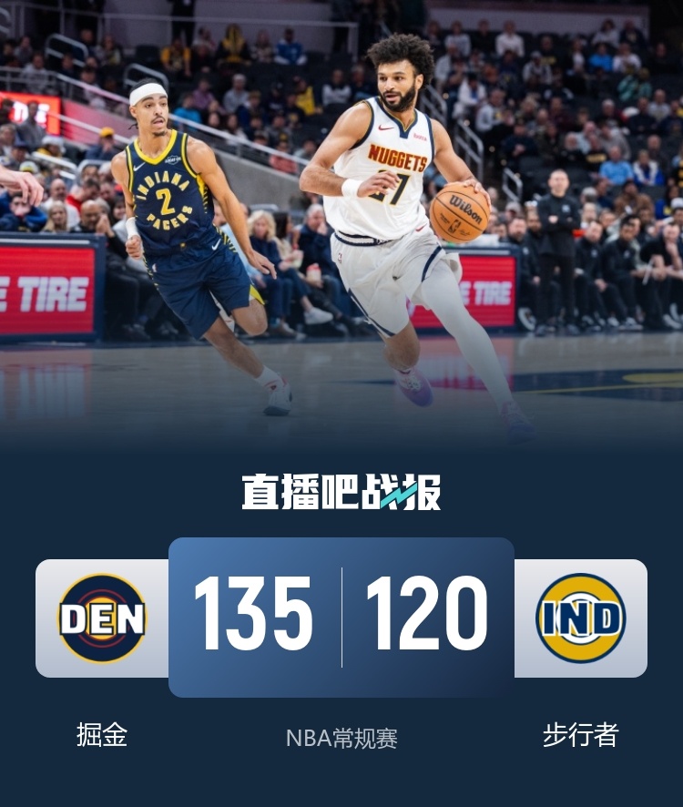 一开场,双方短暂相持,掘金持续发力,穆雷和约基奇联手带队打出13-0的攻击波取得领先,次节步行者轮番冲击内线得手追到只差1分,此后却突然断电,掘金火力全开轰出16-0的攻击波一举获得20分以上优势,半场战罢掘金72-48领先步行者。下半场,本·谢泼德连得8分,约基奇得分助攻一肩挑带队保持优势,末节步行者奋力反击打出13-4缩小分差,又是约基奇和穆雷联手拿分稳住局势,穆雷连中三分拿到个人第50分,步行者苦苦追赶无果。最终,掘金135-120击败步行者,客场过关。
