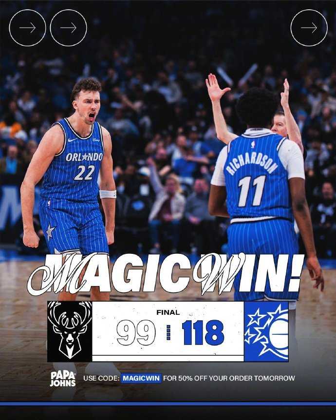 魔术今天在主场以118-99大胜雄鹿,取得一波三连胜,战绩来到28胜24负,继续排在东部第七。而雄鹿三连胜遭到终结,战绩来到21胜30负,继续排在东部第十二。这还是两队本赛季首次交手,下一场两队还将继续交手。前两节半,两队还有来有往,但雄鹿第三节20-36净负16分,一下子就落后到两位数,最终输给了魔术。