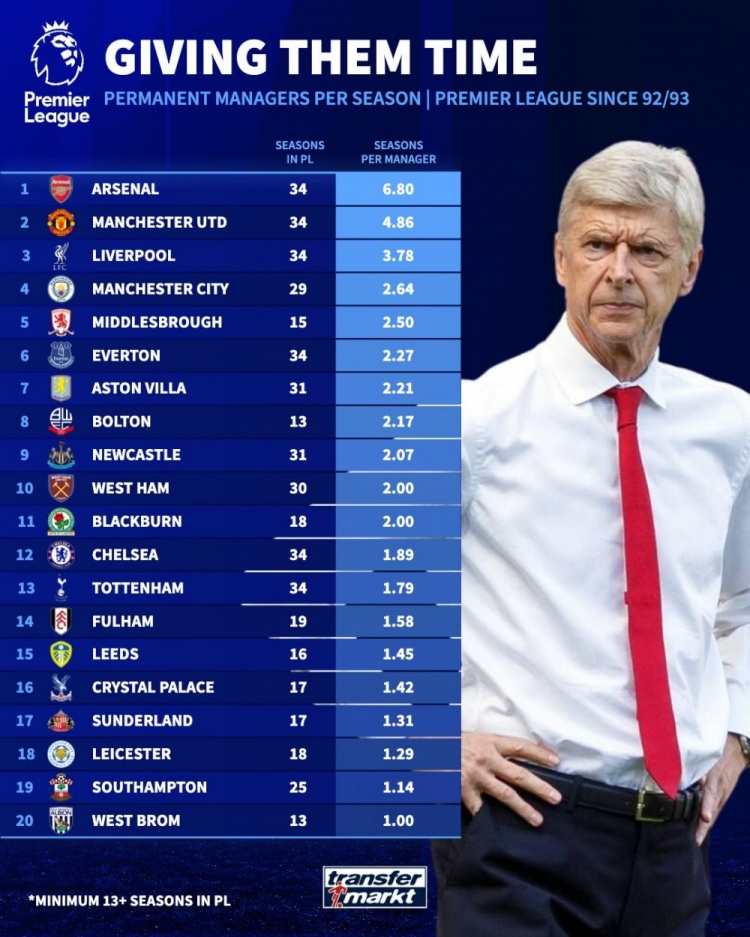10月22日讯 《转会市场》统计了英超各队的历任正式主教练平均执教年限情况,阿森纳无悬念居首。