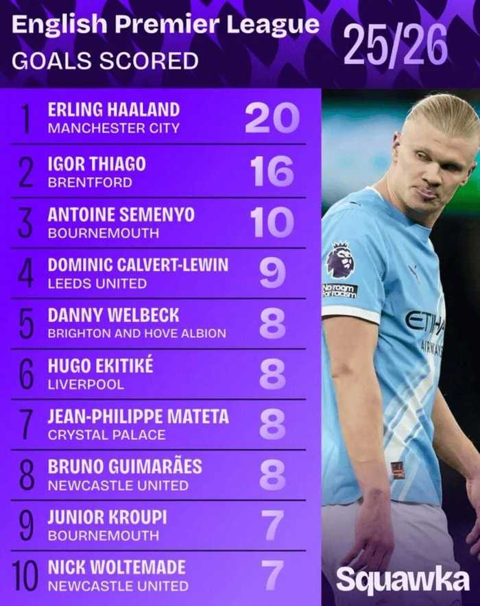 根据Squawka的统计,哈兰德是本赛季五大联赛首位进球数达到20球的球员。伊戈尔-蒂亚戈则成为了单赛季英超进球最多的巴西球员。