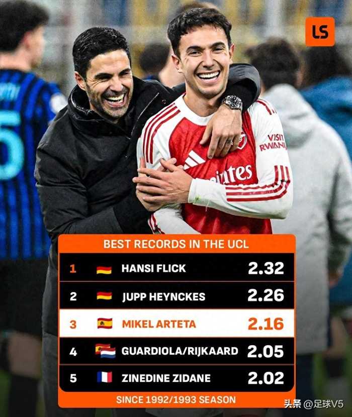 少帅阿尔特塔的欧冠场均积分高达2.16分,力压瓜迪奥拉、安切洛蒂等传奇教练,在历史榜单中仅次于弗里克和海因克斯。
